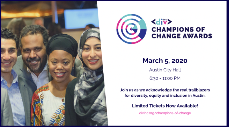 January 15, 2020 - Austin, TX - DivInc, Austin’s premier nonprofit organization driving diversity, equity and inclusion in the startup ecosystem, today announced the event details and finalists for its 2nd annual Champions of Change Awards. DivInc hosts its signature fundraising event, Champions of Change, to celebrate individuals who are making Austin a truly inclusive community.